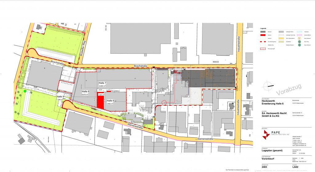 Die Firma Heckewerth in Hiddenhausen (Kreis Herford) ist, als einer der führenden Bearbeiter von Holzwerkstoffen weltweit, bestrebt permanent seine Produktions- und Lagerkapazitäten den hohen Qualitätsansprüchen anzupassen. Im Projekt Neubau zur Erweiterung der Produktionshalle 6 und Änderung der Brandabschnitte in den Hallen 6 bis 9, Boschstraße 36–32, 32120 Hiddenhausen, wird mit der Erweiterung der Halle 6 der Lückenschluss zwischen den Hallen 6 und 8 als Schritt zu einer in sich geschlossenen Produktionskette vollzogen. Die Erweiterung erfordert bauliche Veränderungen im Bestand, da der Brandabschnitt der Hallen 7 und 8 durch eine neue Brandwand verändert wird. Durch diese Maßnahme wird ein fortlaufender Produktionsfluss ohne Unterbrechung von Hallenbegrenzungen ermöglicht. Im Rahmen der Erweiterung der Produktionsanlagen wird eine zusätzliche Filteranlage aufgestellt und eine Aufstellfläche für eine weitere, später folgende Filteranlage angelegt. Die Filteranlagen stellen die immissionsschutzrechtlichen Vorgaben sicher.
